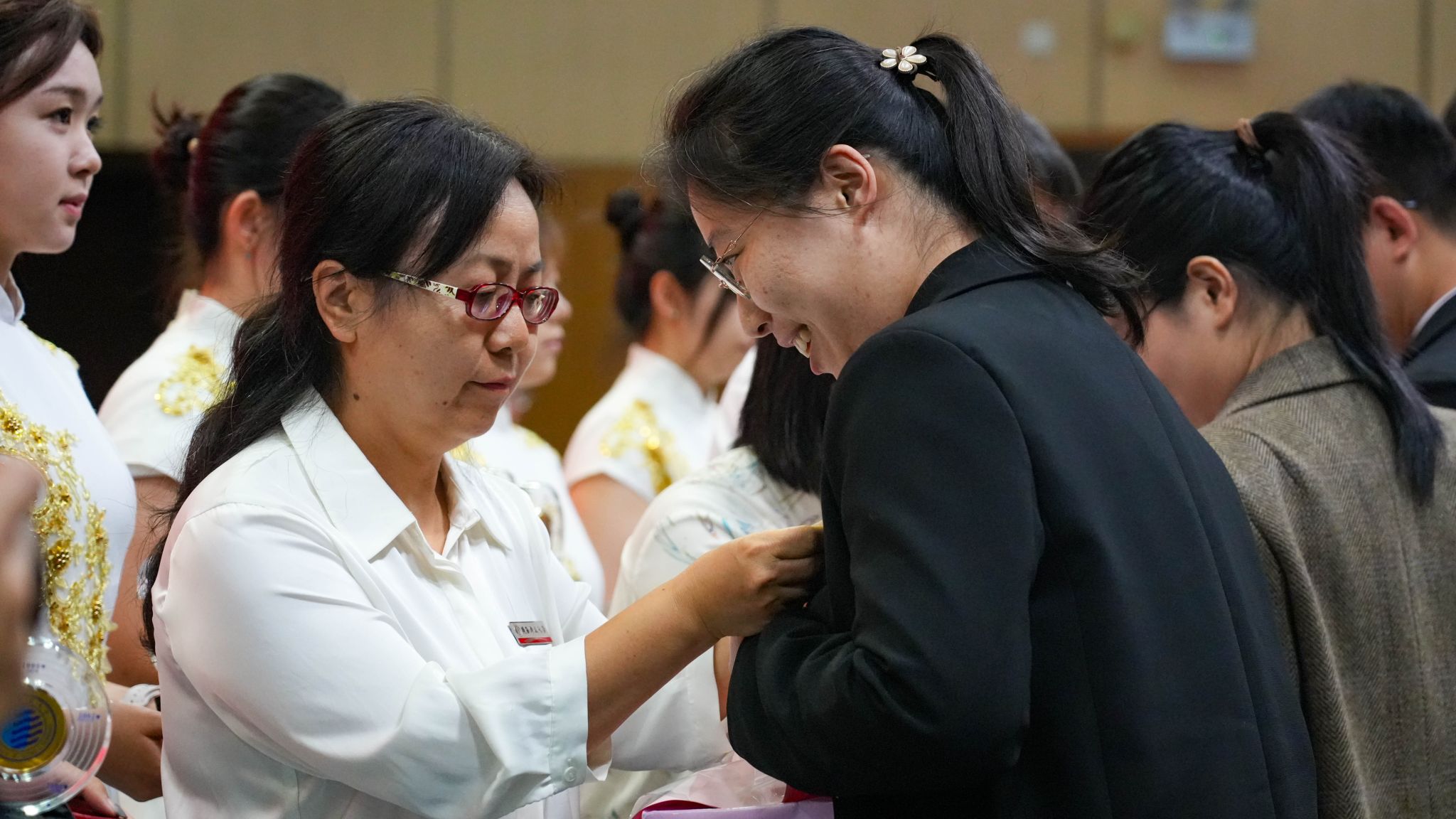 新進教師代表為從教滿三十年教師代表送上鮮花祝福,從教滿三十年教師代表為新進教師代表佩戴?;?。