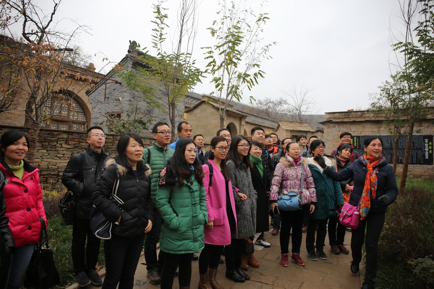 來到棗園革命舊址的時候,金燦燦的陽光正照耀在革命英雄雕像前,遠處的棗樹上還有未掉落的大紅棗,延安姑娘熱心地為大家唱起民歌——“大紅棗兒甜又香,送給咱親人嘗一嘗,一顆棗兒一顆心,心心向著共產(chǎn)黨”。走在延安城里,大家隨時都會被人民群眾的淳樸與熱情所感染,作為革命圣地,這里的人民與黨和軍隊有著濃得化不開的深情,每到一處革命舊址,老鄉(xiāng)就會熱情地為大家唱一段,“騎白馬,跨洋槍,三哥哥吃的是八路軍的糧”,“山丹丹開花紅艷艷,咱中央紅軍到陜北”,“羊肚子那個毛巾喲三道道藍,紅軍哥哥跟的是劉志丹”。那種充滿了革命樂觀主義精神的熱情與高亢,讓人滿懷振奮與激昂。在文安驛古鎮(zhèn)上的歌譜碑前,青年教師們也情不自禁地唱起了《東方紅》:“東方紅,太陽升,中國出了個毛澤東...”那是從內(nèi)心汩汩流出的聲音,是發(fā)自內(nèi)心對毛澤東思想、對革命精神的崇敬。