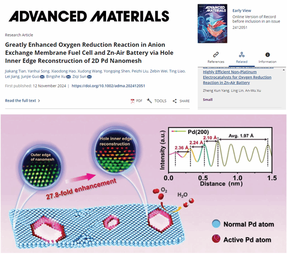 論文詳細(xì)信息:Jiakang Tian?, Yanhui Song?, Xiaodong Hao?, Xudong Wang, Yongqing Shen, Peizhi Liu, Zebin Wei, Ting Liao, Lei Jiang, Junjie Guo*, Bingshe Xu*, and Ziqi Sun*, Greatly Enhanced Oxygen Reduction Reaction in Anion Exchange Membrane Fuel Cell and Zn-Air Battery via Hole Inner Edge Reconstruction of 2D Pd Nanomesh. Advanced Materials. 2024, 2412051.