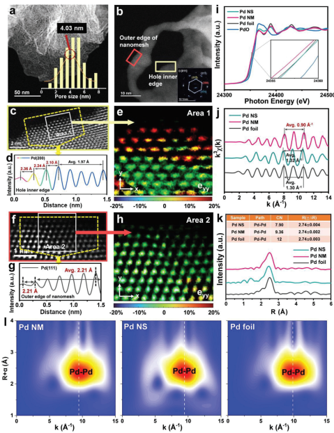基于此,團(tuán)隊(duì)采用簡(jiǎn)單的室溫還原法,以克級(jí)產(chǎn)量制備出一種具有暴露高能面和過(guò)度拉伸晶格參數(shù)的孔內(nèi)重構(gòu)邊緣的新型二維鈀納米網(wǎng)結(jié)構(gòu)。研究結(jié)果表明,這種新型孔狀結(jié)構(gòu)顯著提升了Pd在電化學(xué)氧還原反應(yīng)(ORR)中的催化性能,在0.9 VRHE下,其質(zhì)量活性達(dá)到2.672 A mg?Pd?1,分別是商用Pt/C和Pd/C的27.8倍和23.6倍。在氫氣-空氣陰離子交換膜燃料電池和Zn-空氣電池的實(shí)際應(yīng)用中,該P(yáng)d催化劑的峰值功率密度分別為0.86和0.22 W?cm?2,而商用Pt/C催化劑的峰值功率密度分別為0.54和0.13 W?cm?2。這一結(jié)果表明,通過(guò)孔內(nèi)重構(gòu)邊緣調(diào)控工程,電催化劑設(shè)計(jì)進(jìn)入了一個(gè)全新的研究方向。